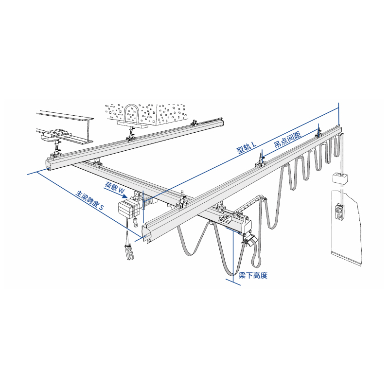 ・ビーム高さ: これは、トロリーがホイストから吊り下げられているメインビームの高さを指します(自立構造の場合、これは通常、地面または柱の支持点から計算されます)。